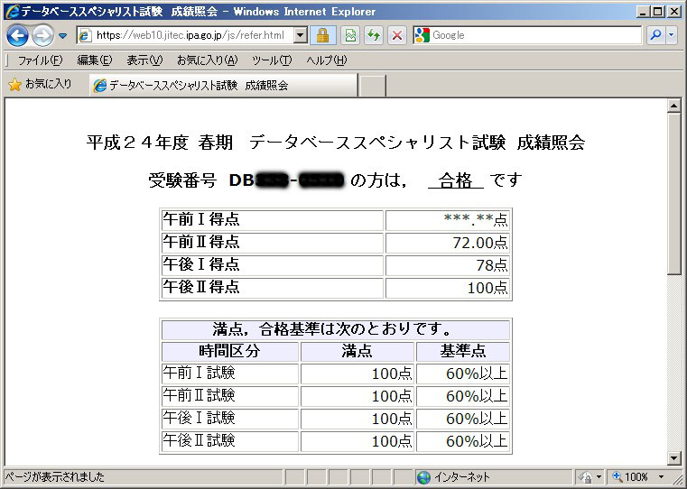 なんと,午後2が「100点!」ということで,成績照会のキャプチャ画像もいただいています。