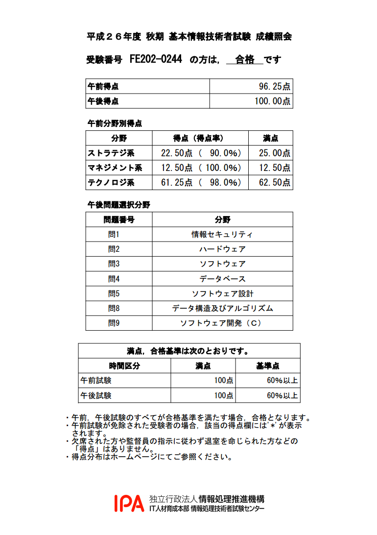 前回の記事から間があいてしまいましたが,今日は基本情報技術者試験と情報セキュリティマネジメント試験の合格発表ですね。成績照会はこちらです。(FE,SG)